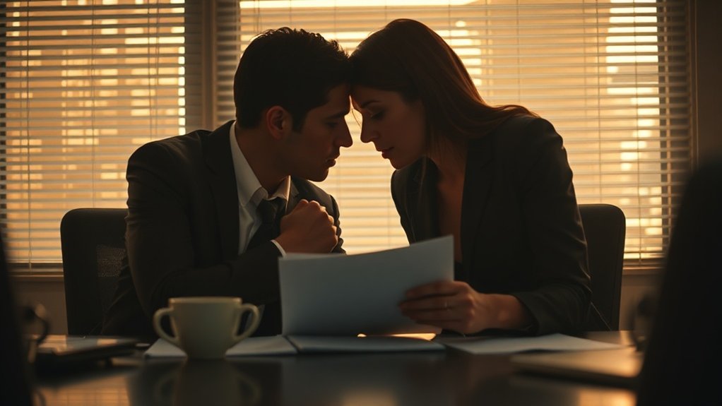 Warning signs include lingering embraces, playful physical teasing, or contact that occurs privately rather than openly. When partners notice their significant other engaging in physical intimacy that exceeds normal colleague interactions, these inappropriate boundaries suggest emotional or physical attraction beyond friendship. It’s essential to address these concerns promptly, especially since licensed professionals are needed to gather evidence if suspicions escalate. Trust concerns arise when workplace relationships involve physical connection that mirrors romantic rather than professional dynamics, requiring honest conversation about relationship expectations.